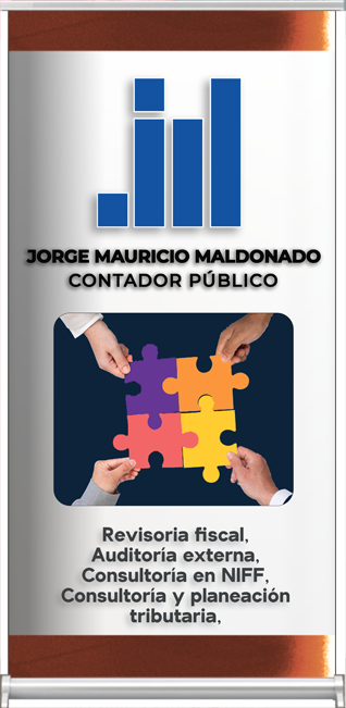 JORGE MAURICIO MALDONADO MALDONADO, ofrece los servicios de asesoría por el sistema outsourcing, y directamente en algunas empresas; en las áreas de revisoría fiscal, tributaria, contable y financiera. Contamos con personal idóneo y con gran sentido de responsabilidad que día a día garantizamos a nuestros clientes un trabajo optimo y de excelente calidad que permite a las empresas obtener relaciones con las entidades financieras en cuanto a créditos y demás servicios que son de absoluta garantía para el desarrollo de su negocio.